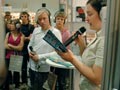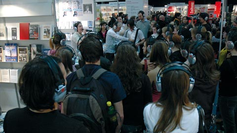 Literarische Funkkopfhörer-Durchwanderung einer Buchmesse.