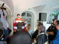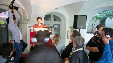 ?Das Publikum befindet sich, umgeben vom urbanen Lärm, vor und um die Bühne und lauscht wahlweise den RednerInnen oder – über Kopfhörer isoliert – dem puren Sound. Der Marktplatz verwandelt sich schleichend in einen quasi lautlosen Dancefloor. Die PassantInnen staunen. Inszenierte Politik vs. inszenierte Unterhaltung.