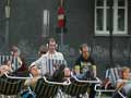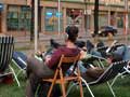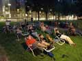 Das Publikum sitzt im Freien auf der Grünfläche des Margaretengürtels/Höhe